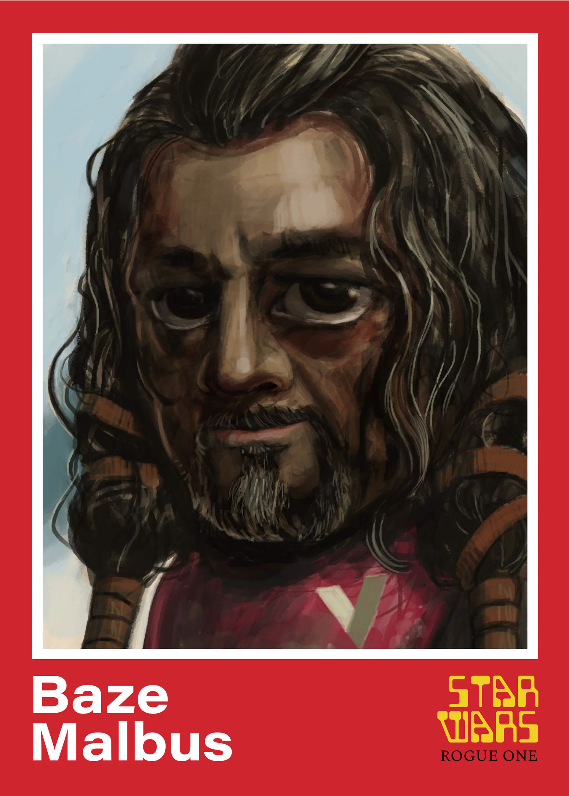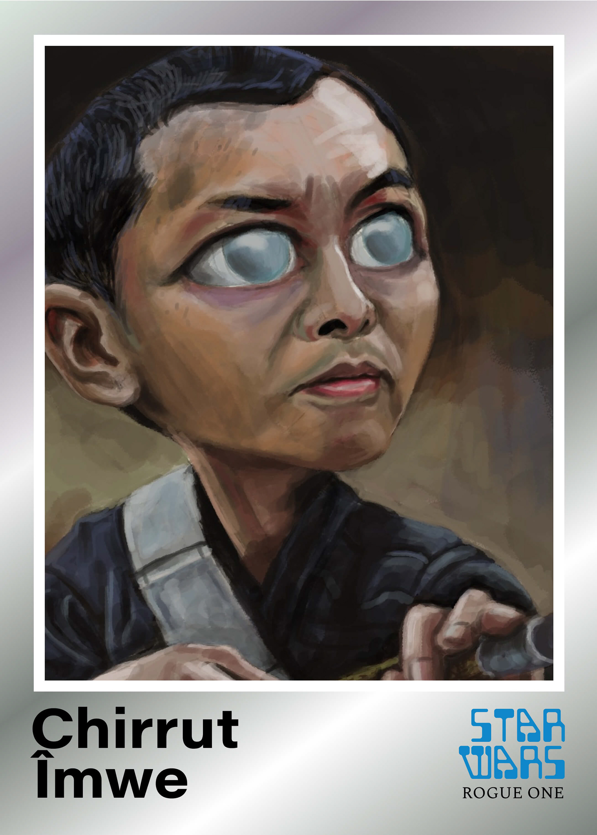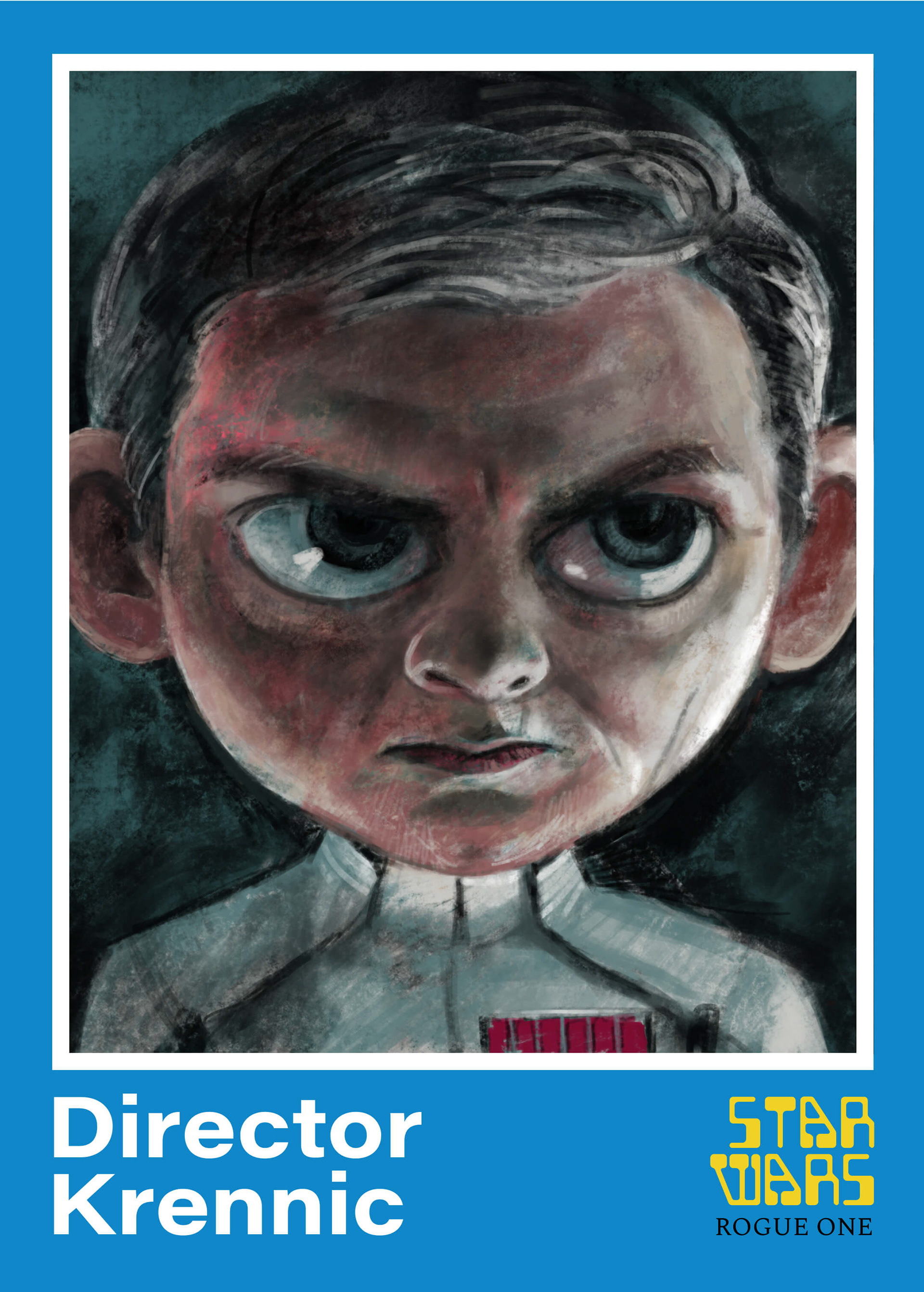 I did digital paintings of some of the characters from the film Rogue One. They are shown here in a trading card design.